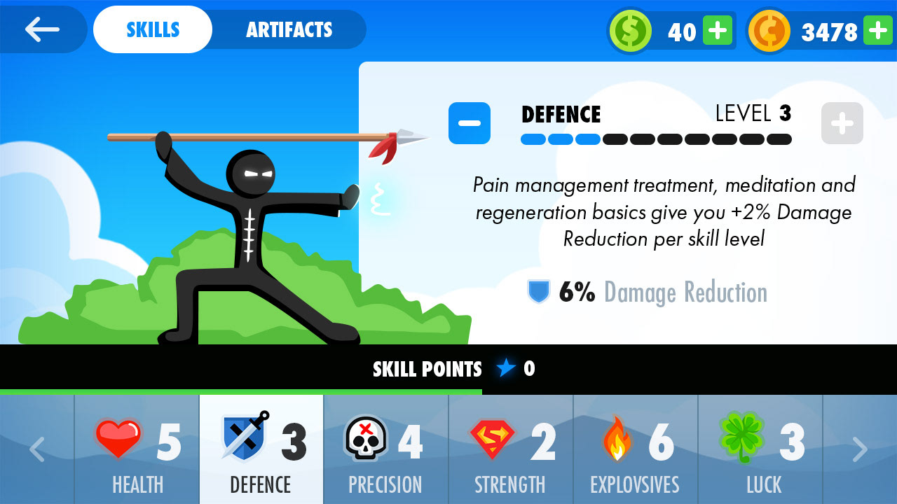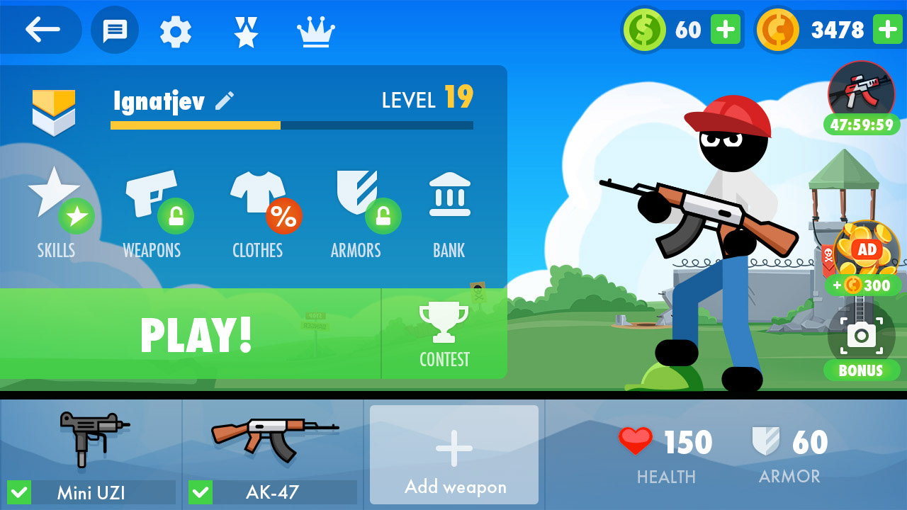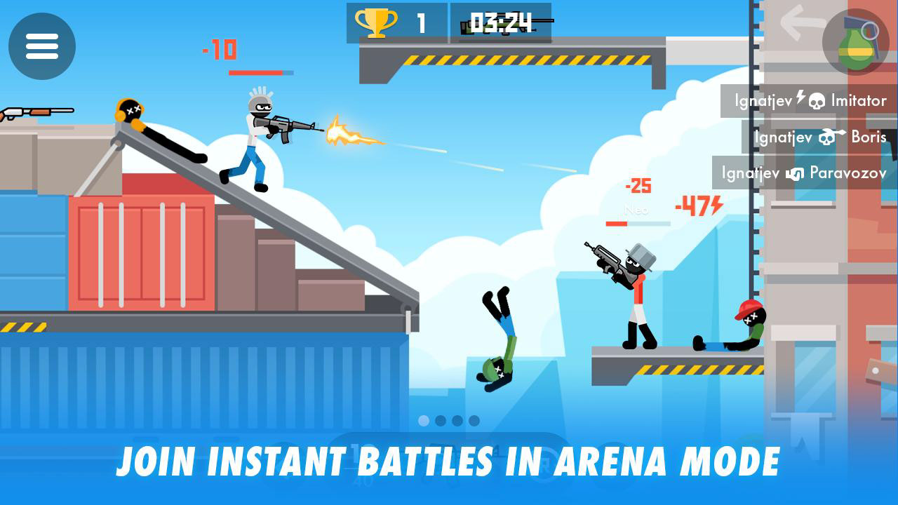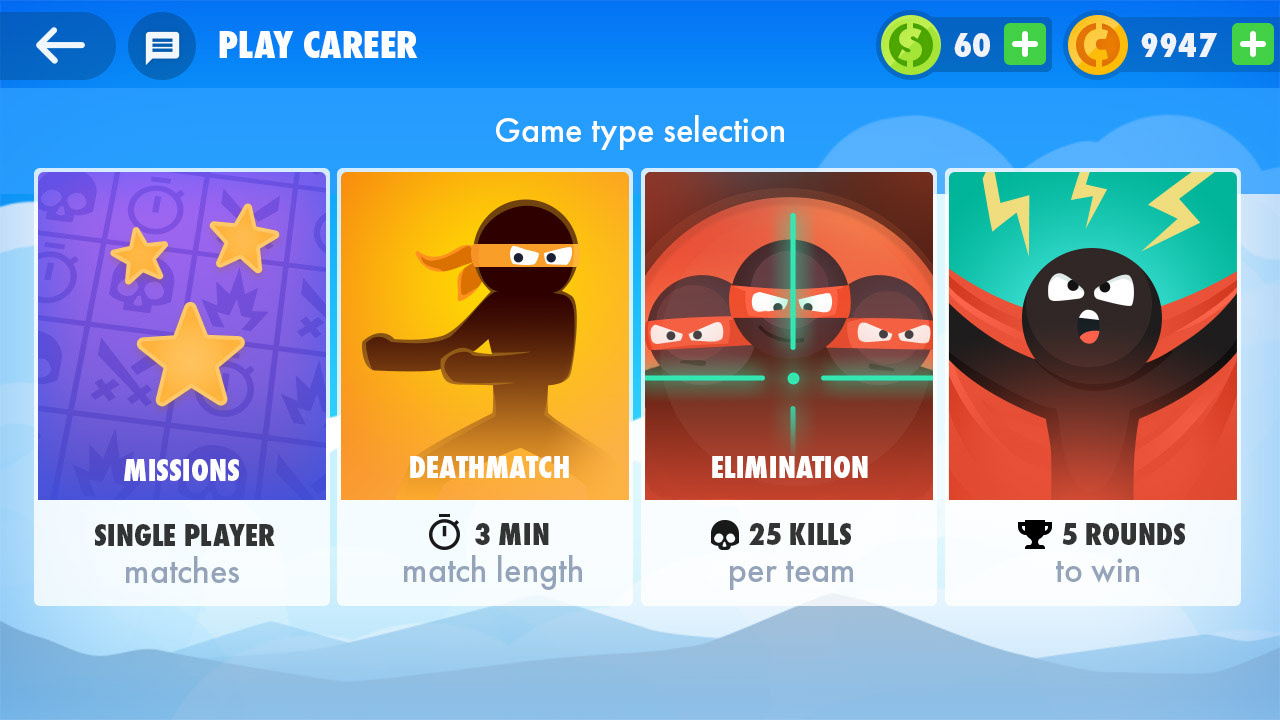 Stickman Combats is a mobile multiplayer shooter game in stickman setting. One of my main tasks on that project was design of user interface. Game has a complex interface with different game modes, clothes and weapons market, skills and armors upgrade.